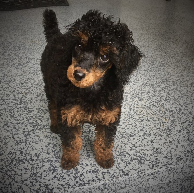 Murphy – gentle and loving. A rare Moyen Poodle with phantom markings. He is 19″ tall and we fell in love with him at first sight. He is quiet and loyal, calm and even, traits we look for in all our puppies.